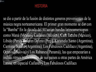 El documento resume dos bandas de rock latinoamericano destacadas: Molotov, una banda de rock formada en la Ciudad de México en 1995 conocida por sus letras críticas al gobierno y sobre mujeres y fiestas; y Doctor Krápula, una banda colombiana de rock punk y ska que transmite mensajes de transformación y conciencia a través de su música popular mestiza.
