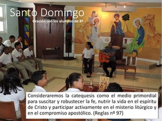 El documento contiene varias citas de las Reglas de los Hermanos de las Escuelas Pías que se refieren a la importancia de la catequesis y la educación religiosa. Resaltan la necesidad de formar catequistas cualificados, organizar grupos para niños y jóvenes, y vincular la catequesis con la liturgia y la vida sacramental.