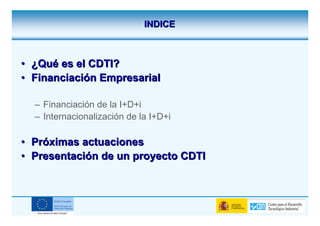 El Centro para el Desarrollo Tecnológico Industrial (CDTI) apoya la innovación y la internacionalización de las empresas españolas mediante diferentes instrumentos financieros, incluyendo subvenciones y préstamos para proyectos de I+D+i. Desde su creación en 1977, el CDTI ha facilitado la financiación de proyectos individuales y en cooperación, con condiciones adaptadas a las necesidades de pequeñas y grandes empresas. También promueve la participación en programas internacionales y fomenta la creación de nuevas empresas tecnológicas a través de iniciativas como Neotec.