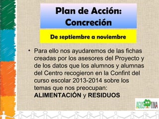 Este documento presenta el plan de acción de un colegio para mejorar la sostenibilidad en las áreas de alimentación y residuos entre septiembre y junio. El plan incluye revisar propuestas, concretar acciones, implementar y evaluar el plan, preparar conferencias internas y externas, y celebrar el Día Mundial del Medio Ambiente. Un estudiante representará al colegio en una conferencia estatal en noviembre.