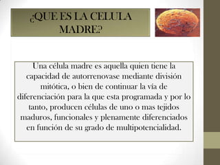 Este documento describe las células madre, incluyendo que son células capaces de autorrenovación o diferenciación, y los diferentes tipos: embrionarias (totipotentes y pluripotentes), adultas (multipotentes y unipotentes). También explica técnicas para obtener células madre, sus aplicaciones potenciales y ventajas/desventajas.