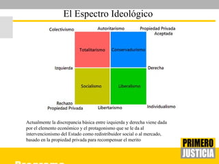 Este documento presenta una perspectiva moderada entre la derecha y la izquierda política. Explica los conceptos básicos de derecha e izquierda en términos de intervención estatal versus mercado libre, y define varias ideologías como el socialismo, liberalismo, conservadurismo y totalitarismo. Argumenta que solo las alas moderadas de cada lado son compatibles con la democracia, y que una política de centro no necesariamente implica un compromiso entre extremos sino una superación de ellos.