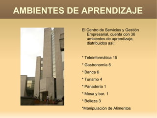 El Centro de Servicios y Gestión Empresarial del SENA Regional Antioquia cuenta con 36 ambientes de aprendizaje distribuidos en diferentes programas como teleinformática, gastronomía, banca, turismo, panadería, mesa y bar, belleza y manipulación de alimentos. Los ambientes se encuentran en los 10 pisos del edificio y cuentan con auditorios, oficinas administrativas, aulas de desarrollo de software y ambientes tecnológicos.