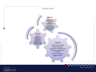 El documento describe los servicios de Corporate Finance Optimization (CFO), una consultora que ayuda a empresas extranjeras a establecerse en España al optimizar el funcionamiento de sus departamentos financieros. CFO ofrece servicios como la creación de departamentos financieros, consultoría financiera, la implementación de centros de servicios compartidos, y asesoramiento en auditoría financiera.