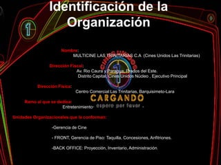 Este documento describe el procesamiento de datos relacionado con la venta de boletos en un cine llamado MULTICINE LAS TRINITARIAS C.A. El proceso de venta de boletos se lleva a cabo utilizando el software VISTA versión FRONT, que genera varios reportes como boletos, facturas fiscales y recibos de pago con tarjeta. Este proceso es muy importante para el negocio del cine ya que genera la mayor parte de sus ingresos.