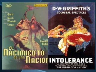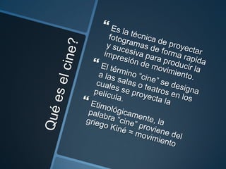 El documento resume la historia del cine desde sus inicios en 1895 cuando los hermanos Lumière presentaron la primera película en París, hasta las primeras décadas del siglo XX cuando películas como El nacimiento de una nación y Intolerancia tuvieron gran influencia. También describe los roles clave del equipo técnico de una película como el productor, director, guionista, y departamentos de sonido y montaje, así como géneros cinematográficos como el cine independiente, de animación, documental, experimental y de autor.