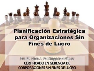 Este documento presenta los conceptos básicos de la planificación estratégica para organizaciones sin fines de lucro. Explica los componentes clave de la planificación estratégica como la misión, visión, valores, análisis interno y externo, y matriz SWOT. Además, discute las diferencias en la planificación estratégica para organizaciones no lucrativas en comparación con organizaciones lucrativas.
