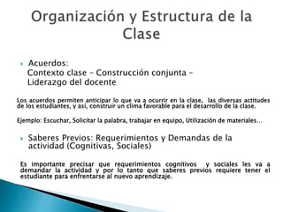 Este documento describe los elementos clave para una clase efectiva. Se enfatiza la importancia de (1) establecer acuerdos de clase, (2) identificar los conocimientos previos de los estudiantes, y (3) fomentar el trabajo colaborativo. También recomienda (3) seleccionar materiales pedagógicos adecuados y (4) realizar evaluaciones formativas para mejorar el aprendizaje.