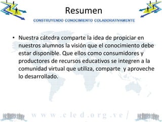 Este documento describe un taller de informática y educación para estudiantes de educación inicial. El taller cubre temas relacionados con las tecnologías de la información y la comunicación en el ámbito educativo y su impacto en la educación inicial. El sitio web del taller fue desarrollado utilizando software libre y ofrece material teórico, ejemplos de proyectos finales de los estudiantes, y planes para mejorar el uso de recursos educativos abiertos y herramientas multimedia en el futuro.