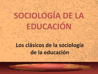 El documento presenta una introducción a la sociología de la educación. Explica conceptos clave como sociedad, socialización y los principales agentes de socialización. También resume los orígenes de la sociología y los principales paradigmas teóricos. Finalmente, analiza la definición de educación según Durkheim, explicando que la educación es la acción de las generaciones adultas sobre las más jóvenes para transmitir los valores e ideales de la sociedad y así garantizar su reproducción.
