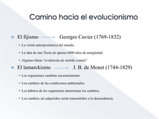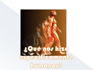 Este documento resume la evolución humana desde los primeros homínidos como Australopithecus afarensis hasta el Homo sapiens. Explica las teorías del evolucionismo de Cuvier, Lamarck y Darwin, así como los descubrimientos posteriores de Mendel sobre la herencia y la teoría sintética moderna. También describe los fósiles clave como Lucy y los cambios anatómicos que nos hicieron humanos como la bipedestación y el incremento del cerebro.
