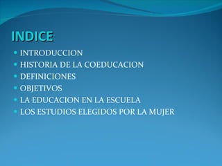 El documento resume la historia y definiciones clave de la coeducación. También discute los objetivos de la coeducación, como fomentar la igualdad de género y el respeto mutuo. Explica que históricamente la educación de niñas y niños era diferente, pero que ahora la coeducación se enfoca en brindar la misma educación a todos.