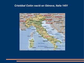 Cristóbal Colón nació en Italia en 1451 y quería demostrar que la Tierra era redonda. Zarpó de España en 1492 con tres barcos y llegó a una isla en las Américas el 12 de octubre de ese año, aunque creía haber llegado a Asia. Colón murió en España en 1506.