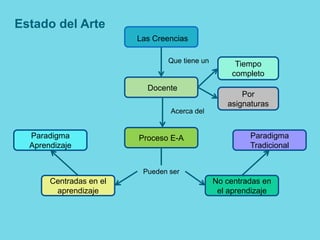 Este documento presenta un resumen de una tesis de maestría que examina las creencias de los docentes de educación superior en Sonora, México acerca del aprendizaje y la enseñanza. El estudio analiza las creencias de 105 docentes de tres instituciones (UNISIERRA, UVM e ITH) a través de cuestionarios, y entrevista a 7 docentes para explorar más a fondo sus creencias. El objetivo es determinar si las creencias de los docentes se centran más en el aprendiz y el aprendizaje, o en la ense