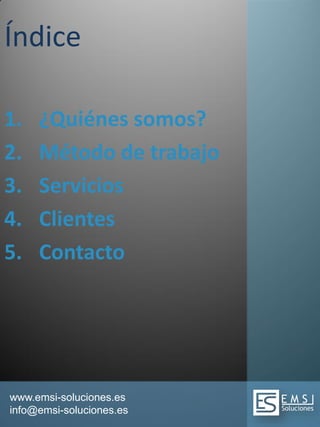 EMSI Soluciones es una empresa de consultoría y servicios informáticos que ofrece asesoramiento, hardware, software, hosting, mantenimiento y desarrollo de páginas web a pequeñas y medianas empresas. Trabajan con un método automatizado para agilizar los procesos con clientes como Telefónica, BBVA, Pelayo y organismos del estado. Proporcionan servicios de resolución de incidencias, mantenimiento preventivo y desarrollo de soluciones a medida.