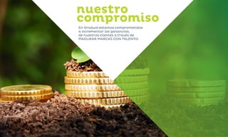 Este documento describe la filosofía de una agencia de mercadotecnia llamada Gradual que se enfoca en descubrir y desarrollar el "talento" inherente de las marcas de sus clientes para aumentar sus ventas a través de campañas de marketing creativas y diferenciadas de la competencia. La agencia ha desarrollado una metodología propia para lograr este objetivo y ofrece una variedad de servicios como consultoría de marketing, organización de eventos, marketing electrónico, diseño de stands y displays.