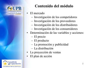 El documento describe los conceptos clave del módulo de mercadeo y comercialización para empresas rurales. Explica cómo investigar el mercado, los competidores, proveedores, distribuidores y consumidores para desarrollar un plan de acción de marketing efectivo que incluya variables como precio, producto, promoción, distribución y proyección de ventas. También presenta el modelo de gestión integral BMS para lograr la competitividad a través de la definición del negocio, segmentación, posicionamiento y gestión estratégica.