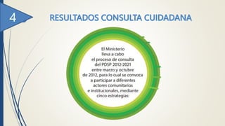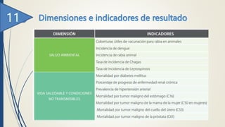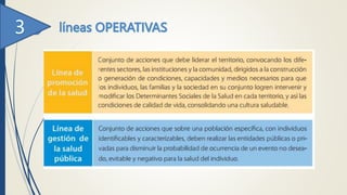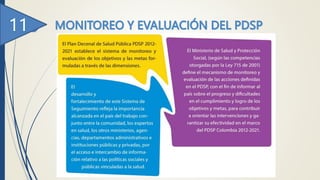 Este documento describe el Plan Decenal de Salud Pública 2012-2021 de Colombia. Presenta los objetivos y estrategias del plan organizados en 10 dimensiones: planificación, determinantes sociales de la salud, enfermedades no transmisibles, salud mental y convivencia social, violencia y accidentes, seguridad alimentaria y nutricional, inocuidad de alimentos, derechos sexuales y reproductivos, maternidad y paternidad segura, y enfermedades transmisibles. El plan tiene como objetivo principal mejorar las condiciones de vida y salud de la