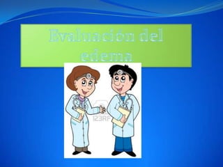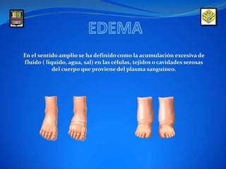 El documento describe los diferentes tipos de edema, sus causas y características. Se explica que el edema es la acumulación anormal de líquido en los tejidos, y que depende del equilibrio entre las fuerzas hidrostáticas y oncóticas en los capilares sanguíneos. Luego se detallan las características clínicas que permiten distinguir los diferentes tipos de edema.