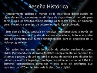 El documento resume los conceptos básicos de la electrónica digital, incluyendo la historia de la lógica cableada y los circuitos integrados, las compuertas lógicas básicas como AND, OR y NOT, y las operaciones lógicas básicas de suma, producto y negación. Explica que las compuertas lógicas producen resultados binarios dependiendo de las entradas, y que las funciones lógicas complejas son combinaciones de las tres operaciones lógicas básicas.
