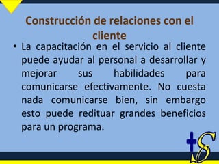El documento describe cómo las organizaciones pueden construir relaciones con los clientes a través de la capacitación en servicio al cliente, escucha activa, y obtención de retroalimentación. Se enfatiza la importancia de escuchar atentamente a los clientes, hacer preguntas abiertas, y discutir aspectos del servicio con el personal y clientes para identificar áreas de mejora.