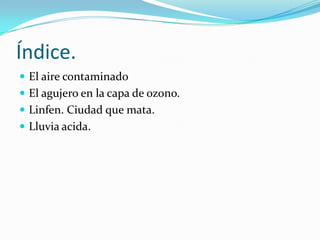 Este documento resume los principales contaminantes del aire como el monóxido de carbono, dióxido de carbono, plomo, óxidos de nitrógeno y partículas. También describe el problema del agujero de la capa de ozono y los esfuerzos del Protocolo de Montreal para reducir los gases que lo causan. Además, analiza la ciudad extremadamente contaminada de Linfen, China, y los efectos dañinos de la lluvia ácida producida por los óxidos de nitrógeno y azufre en la vegetación y vida ac