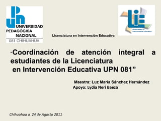 El documento describe varios programas de apoyo a estudiantes de la Licenciatura en Intervención Educativa de la UPN 081, incluyendo programas de tutoría, becas, movilidad estudiantil, atención médica, deportes y actividades culturales, apoyo psicopedagógico y seguimiento de egresados, con el objetivo de brindar una formación integral a los estudiantes y mejorar su desempeño y éxito académico.
