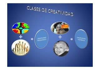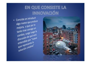 Este documento trata sobre la creatividad e innovación en la tecnología educativa. Brevemente describe que la creatividad implica buscar nuevas formas de enfrentar el mundo e innovar para resolver desafíos. También menciona que la creatividad involucra proponer nuevas soluciones que inicialmente parecen novedosas pero luego son aceptadas culturalmente. Explica procesos como la incubación para desarrollar ideas creativas. Finalmente, señala que la innovación educativa busca acercar al estudiante a su propio aprendiz