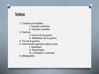 El documento resume las causas, eventos clave y conclusión de la Segunda Guerra Mundial. Las causas incluyen el resentimiento alemán por el Tratado de Versalles, el resurgimiento militar de Alemania y el fracaso de la Sociedad de Naciones. Los eventos destacados son la invasión de Polonia en 1939, la invasión de la Unión Soviética en 1941 y el desembarco de Normandía en 1944. La guerra finalizó con la rendición de Alemania e Italia en 1945 y la rendición de Japón en agosto de 1945.
