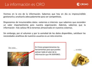 El documento describe una solución de Business Intelligence llamada Crono que permite a las organizaciones extraer valor de la información que ya tienen almacenada. Crono ofrece herramientas para acceder y analizar datos de manera más eficiente que usando Excel, y ayuda a establecer una "versión única de la verdad" de los datos. La solución incluye capacidades de extracción, transformación y carga de datos, informes e indicadores personalizables, y puede adaptarse a proyectos grandes o pequeños.
