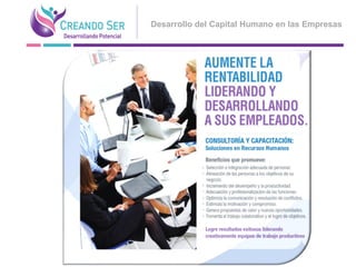 El documento presenta una empresa de consultoría y capacitación que se especializa en el desarrollo del capital humano, ofreciendo estrategias para mejorar la productividad y la calidad de vida de individuos y organizaciones. Con un equipo interdisciplinario, se promueve el aprendizaje continuo y el bienestar a través de coaching, capacitaciones y consultorías. La misión es ayudar a las personas a desplegar su potencial y fomentar redes interpersonales saludables.