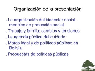 El documento aborda los desafíos en Bolivia para incluir el cuidado como derecho social, destacando la creciente participación de las mujeres en el mercado laboral y las brechas de género en ingresos y seguridad social. Se destaca la necesidad de repensar el cuidado en la agenda pública y la importancia de un marco legal que garantice la corresponsabilidad en estas responsabilidades entre el estado, las familias y el mercado. Finalmente, se hace un llamado a adoptar políticas que reconozcan y valoren el trabajo de cuidado, promoviendo así la equidad de género y mejorando el bienestar social.