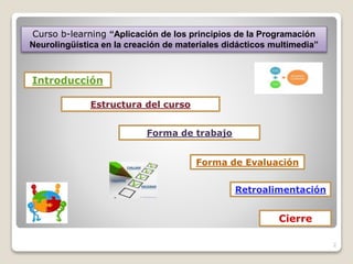 Este documento presenta la estructura y contenido de un curso en línea sobre la aplicación de los principios de la Programación Neurolingüística en la creación de materiales didácticos multimedia, dirigido a docentes de educación media superior. El curso consta de cuatro unidades que cubren materiales didácticos multimedia, estilos de aprendizaje, Programación Neurolingüística y la aplicación de sus principios en la creación de materiales multimedia. El curso incluye sesiones presenciales, en línea y actividades individuales y grupales