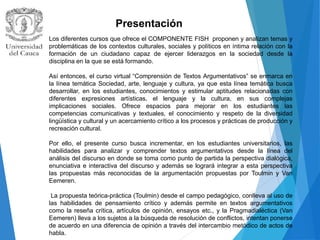 Este documento presenta el curso virtual "Comprensión de Textos Argumentativos" que busca incrementar las habilidades de los estudiantes para analizar y comprender textos argumentativos. El curso se enfoca en enseñar sobre géneros discursivos, análisis del discurso, argumentación y resolución de conflictos. Se evaluará a los estudiantes a través de talleres semanales en línea sobre cada unidad temática.