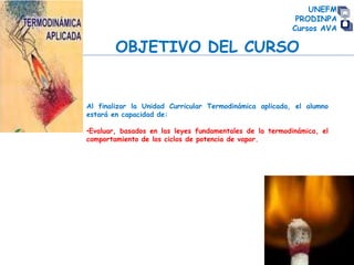 Este documento presenta la información sobre un curso de termodinámica aplicada. El objetivo del curso es enseñar a los estudiantes a evaluar el comportamiento de los ciclos de potencia de vapor basados en las leyes fundamentales de la termodinámica. El curso cubrirá ciclos como el de Carnot, Rankine, Rankine con recalentamiento y regenerativo.