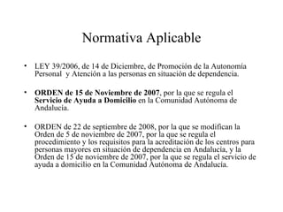 Este documento resume la normativa aplicable al servicio de ayuda a domicilio en Andalucía según la Ley 39/2006 y órdenes de 2007 y 2008. Define el servicio de ayuda a domicilio como el conjunto de actuaciones en el domicilio de personas dependientes para atender sus necesidades diarias de limpieza, lavado, cocina y cuidados personales.