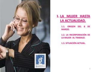 El documento discute el origen y evolución del Día Internacional de la Mujer (8 de marzo). Explica que se originó en 1910 cuando activistas socialistas propusieron una jornada anual de lucha por los derechos de las mujeres. Aunque hubo celebraciones anteriores, el 8 de marzo se estableció como la fecha oficial en honor a las protestas de mujeres rusas en 1917 que ayudaron a derrocar al zar. También describe cómo la Segunda Guerra Mundial llevó a más mujeres al trabajo y marcó el comienzo de