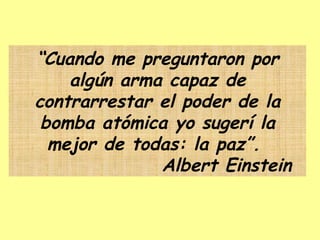 El documento describe el Manifiesto Russell-Einstein de 1955, firmado por once científicos e intelectuales incluyendo a Albert Einstein, advirtiendo sobre los peligros de la proliferación de armas nucleares. Luego se detalla sobre las Conferencias de Pugwash que surgieron de este manifiesto, buscando soluciones pacíficas a conflictos internacionales. Finalmente, brinda información biográfica sobre los firmantes del manifiesto, incluyendo sus logros científicos.