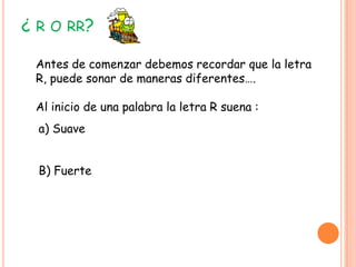 La letra R puede sonar de maneras diferentes al inicio de una palabra. Al inicio de una palabra, la R suena suavemente como en la palabra "ratón".