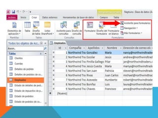 El documento describe Access como una aplicación de Microsoft Office para crear y administrar bases de datos. Explica que viene incluido en algunas versiones de Office como Office Professional y que permite crear y conectarse a bases de datos como SQL Server y MySQL. También describe los componentes básicos de una base de datos en Access como tablas, formularios, informes y consultas.