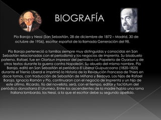 Pío Baroja (1872-1956) fue un destacado escritor español de la generación del 98, conocido por su radical escepticismo y pesimismo existencial, influenciado por filósofos como Schopenhauer. A lo largo de su vida, Baroja realizó múltiples incursiones en la literatura, abordando temas sociales y políticos mediante un estilo realista y personajes marginales. Su obra ha dejado una profunda huella en la literatura, influyendo en autores posteriores con su enfoque sincero y compasivo hacia la humanidad.