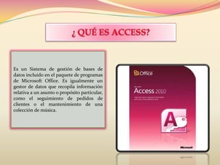 Este documento describe los elementos básicos de Microsoft Access, incluyendo tablas, consultas, formularios, informes, macros, módulos, registros, campos, relaciones y tipos de datos. Proporciona ejemplos de cómo se pueden usar criterios de búsqueda y cómo se pueden mostrar datos como imágenes en formularios.
