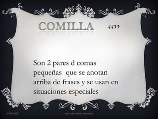 El documento explica el uso de comillas en español y provee 5 ejemplos de oraciones que usan comillas para enfatizar palabras o frases. Las comillas se usan para resaltar palabras especiales como nombres, apodos, títulos de obras y palabras en otros idiomas cuando son incorporadas a una oración en español.