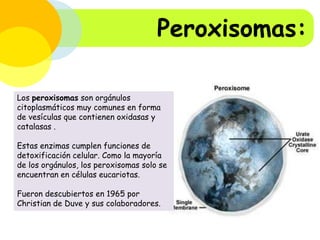 Los peroxisomas son orgánulos celulares que contienen enzimas como las oxidasas y catalasas involucradas en funciones de detoxificación. Fueron descubiertos en 1965 y se encuentran en células eucariotas, donde cumplen un papel importante en la eliminación de sustancias tóxicas.