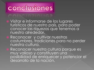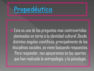 La identidad cultural se construye a través de la interacción con otros y el reconocimiento de los patrones culturales de una comunidad, como las tradiciones y costumbres. Se desarrolla primero en la familia y luego en otros espacios sociales como la escuela o el trabajo. Tiene componentes cognitivo, afectivo y de comportamiento, que implican conocer, valorar y actuar de acuerdo a la cultura de origen. Conocer el pasado cultural de un pueblo es fundamental para generar sentimientos de pertenencia e identificación con ese grupo.