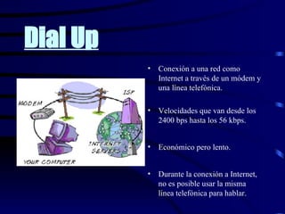El documento describe los principales tipos de conexión a Internet, incluyendo conexión dial-up lenta a través de línea telefónica, banda ancha de 512 kbps a 90 Mbps, ADSL que permite voz y datos a través de línea telefónica a 1.5-6 Mbps de bajada y 16-576 kbps de subida, satélite útil para áreas aisladas a 492-512 kbps con bajada rápida pero subida lenta, y redes inalámbricas compuestas de punto de acceso y dispositivos