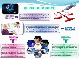 El documento resume la historia del derecho médico desde sus orígenes en el Código de Hammurabi hasta la actualidad. Comenzó como una colección de normas para regular la responsabilidad de los médicos, y evolucionó para incluir el uso de la medicina para resolver problemas legales. Un hito clave fue el establecimiento de las primeras cátedras de medicina legal en universidades alemanas en el siglo XVI. Hoy en día, la medicina legal aplica conocimientos médicos y biológicos para ayudar a resolver casos legales.