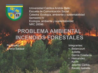Este documento presenta información sobre los incendios forestales. Aborda las causas de los incendios forestales, los tipos de incendios y sus consecuencias ambientales y económicas. Propone soluciones a nivel social, económico, legal, técnico y de comunicación para prevenir y combatir los incendios forestales. Además, incluye una propuesta concreta de organizar brigadas de voluntarios para realizar labores de recolección de desechos en áreas verdes y crear conciencia ambiental.