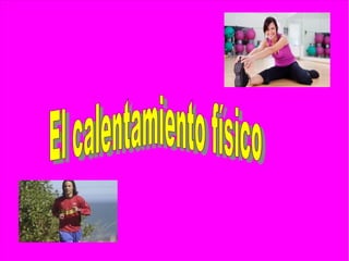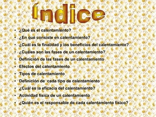 El documento describe los diferentes aspectos del calentamiento, incluyendo su definición, objetivos, beneficios, fases, tipos y eficacia. El calentamiento consiste en realizar ejercicios de baja a alta intensidad para preparar el cuerpo para el ejercicio y prevenir lesiones. Sus fases principales son la movilidad articular, estiramientos globales, activación muscular central y calentamiento específico o cardiovascular. Tiene beneficios como mejorar la coordinación, rendimiento físico y prevenir lesiones.