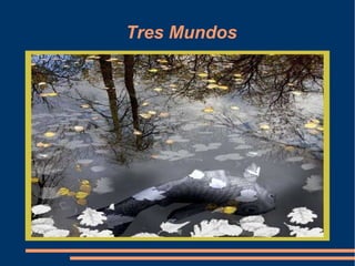 Este documento resume la obra "Tres mundos" del artista holandés Maurits Cornelis Escher, pintada en 1955. La obra logra reflejar tres mundos en una sola imagen: la superficie del agua con hojas, la profundidad del agua con un pez, y el exterior con el reflejo de los árboles. El documento también proporciona instrucciones para que los estudiantes intenten imitar la técnica de Escher y resalta las lecciones aprendidas sobre el arte y el artista.